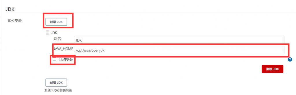 在刚刚的页面点击“新增JDK”,并取消“自动安装”。在JAVA_HOME输入刚刚复制的路径。