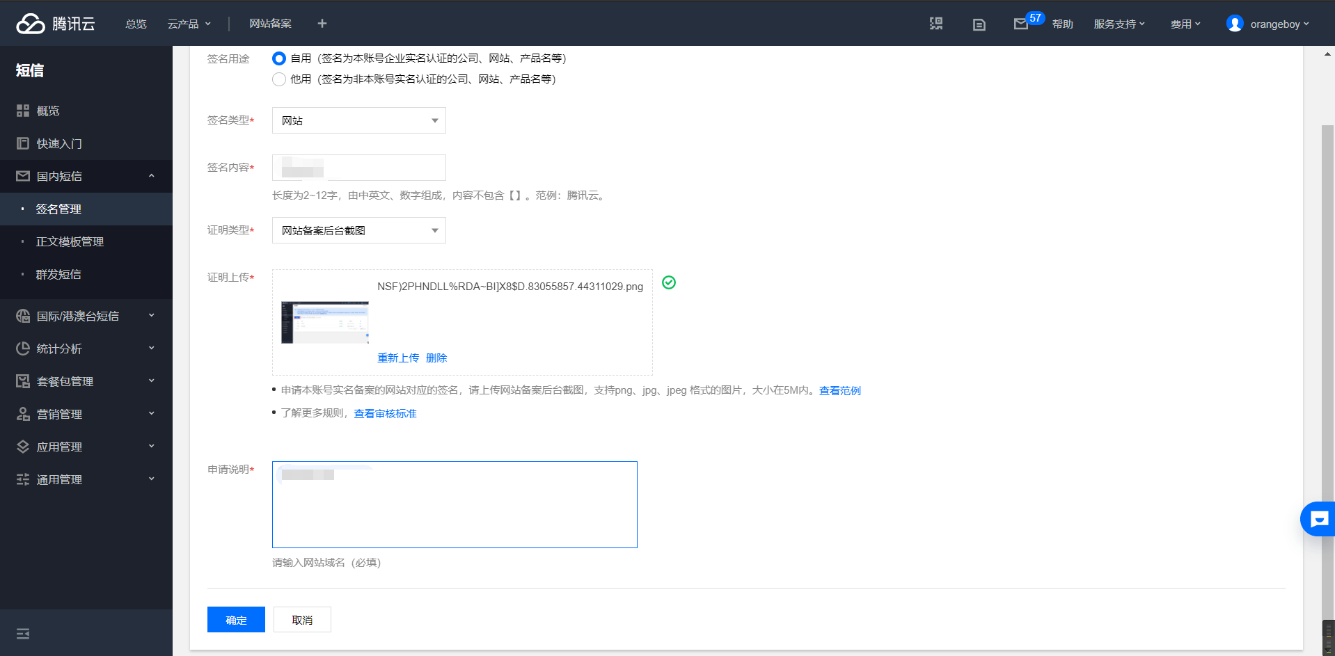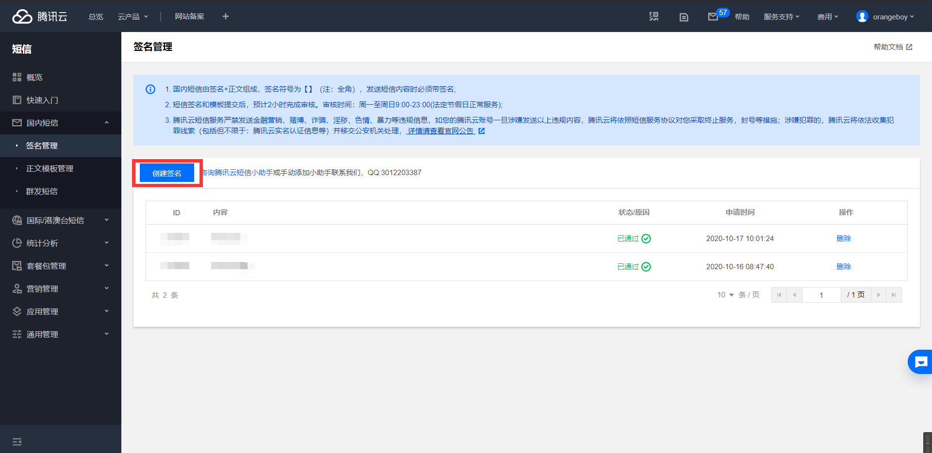 点击侧边栏xx短信->签名管理