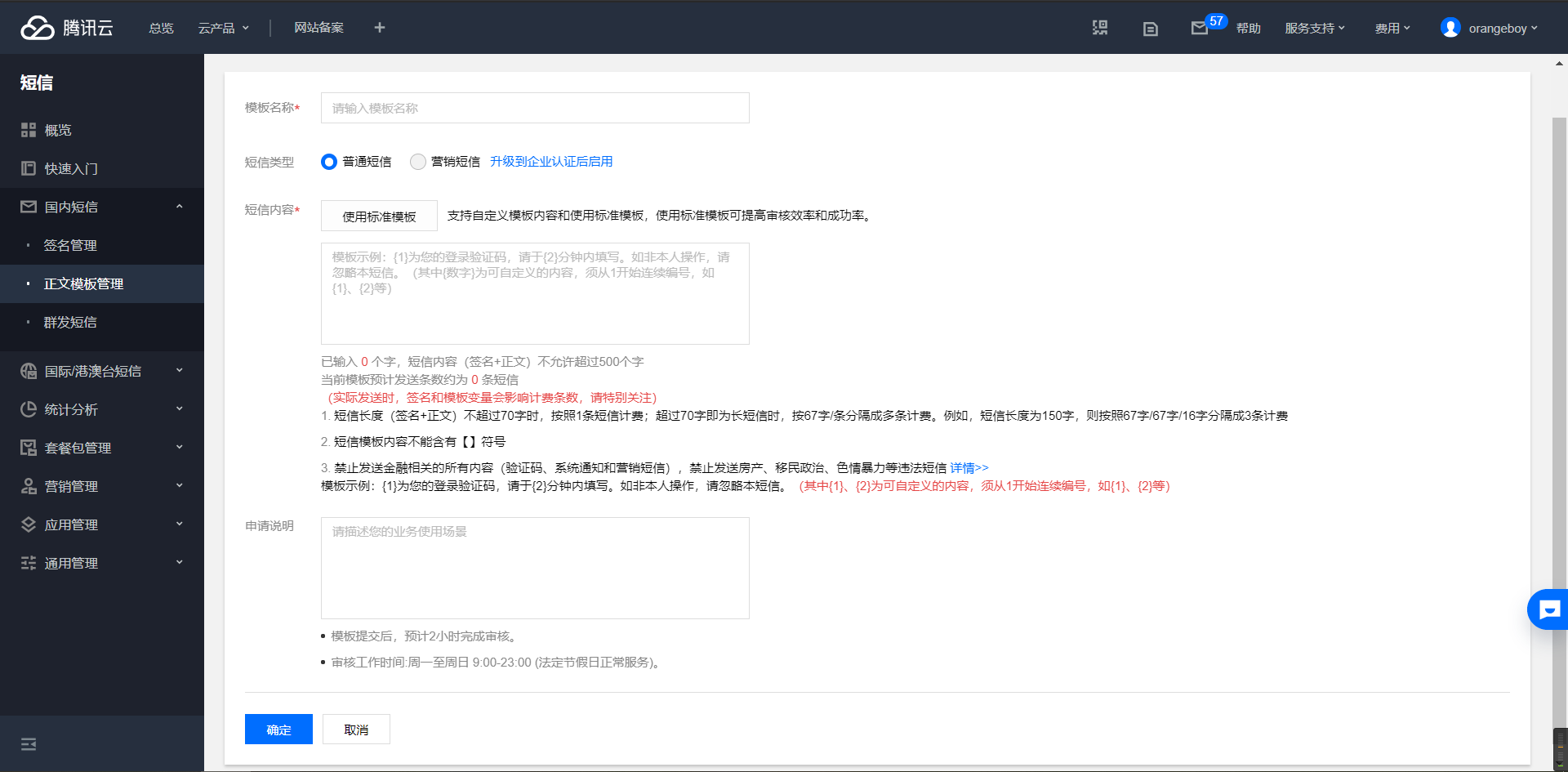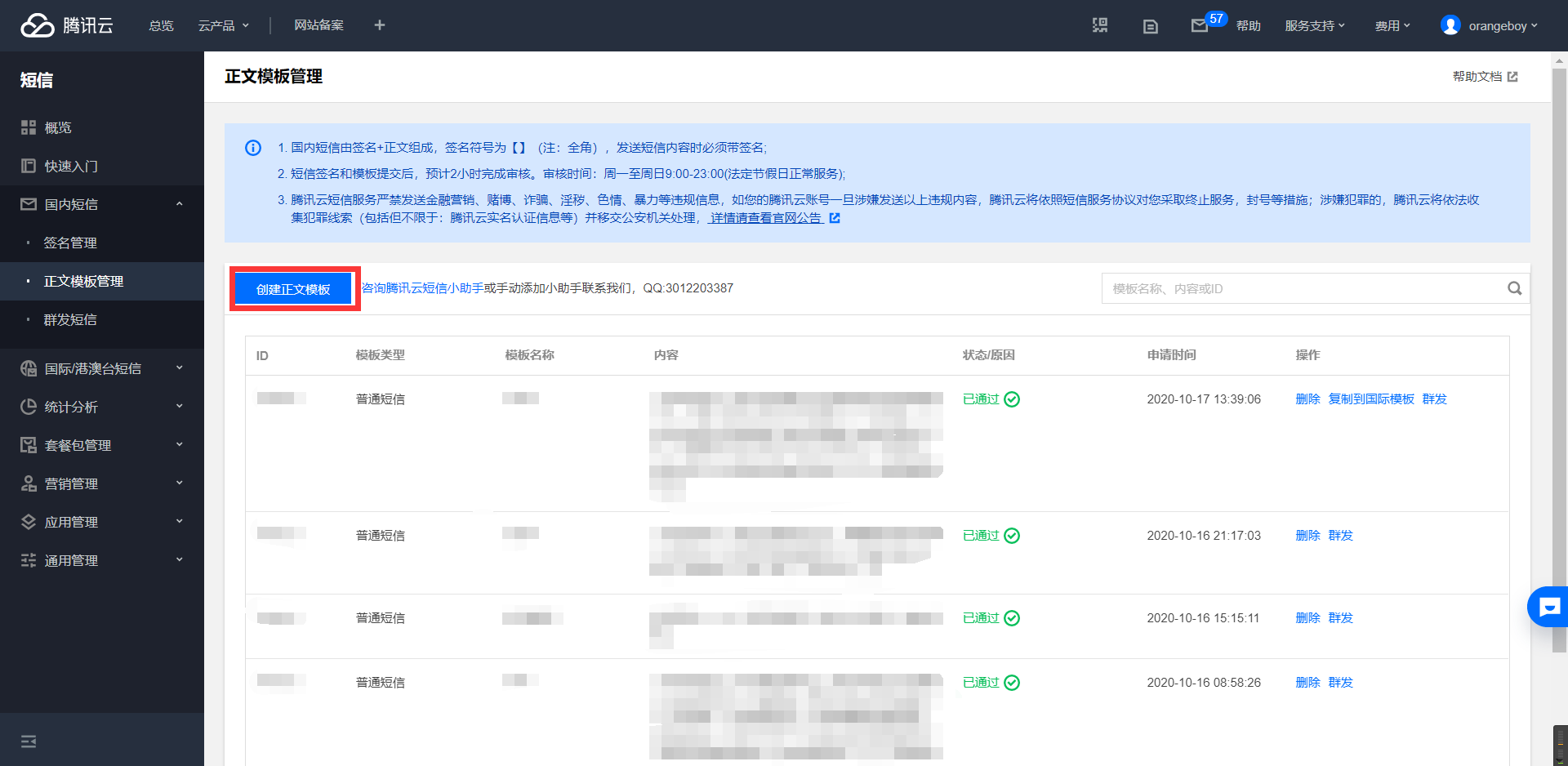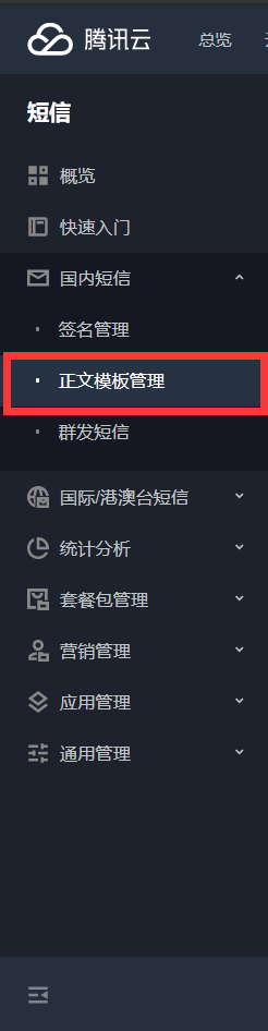 点击侧边栏xx短信->正文模板管理