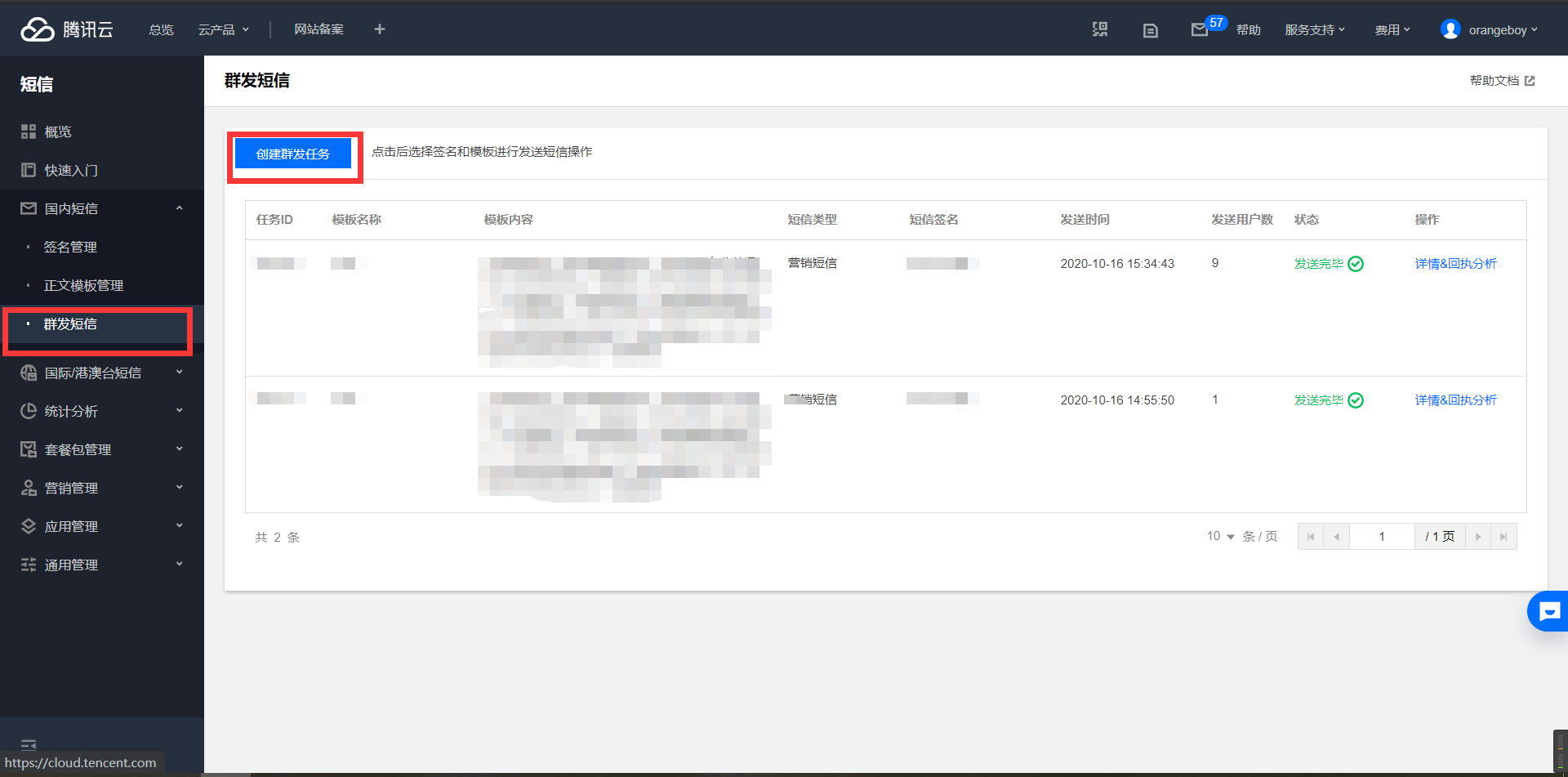 点击侧边栏xx短信->群发短信,然后点击创建群发任务