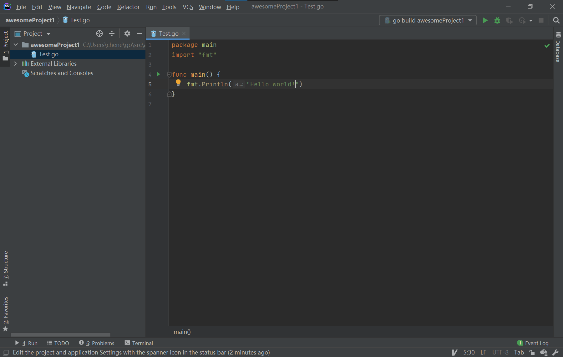 在目录下创建文件Test.go,在Test.go输入以下内容